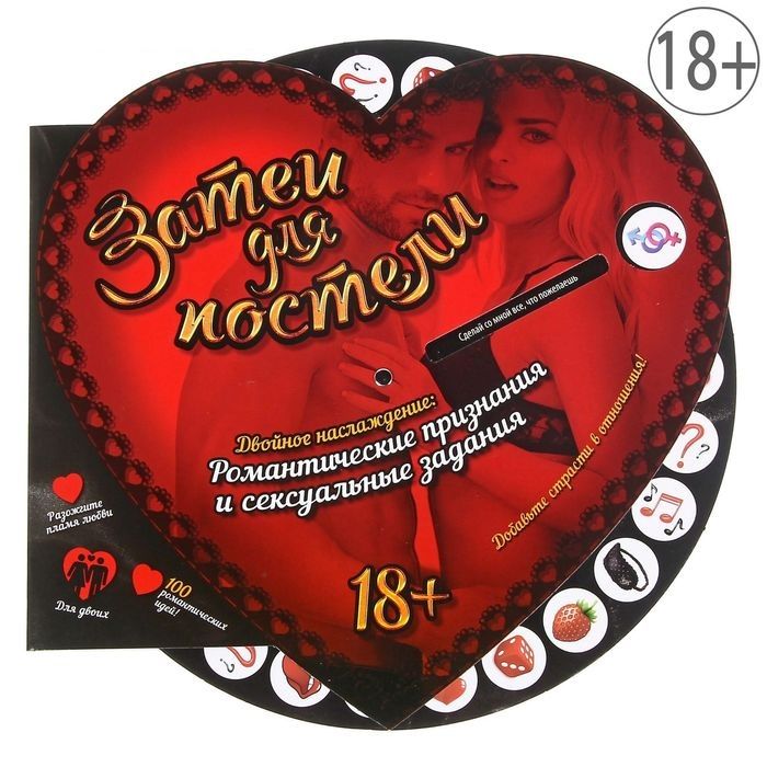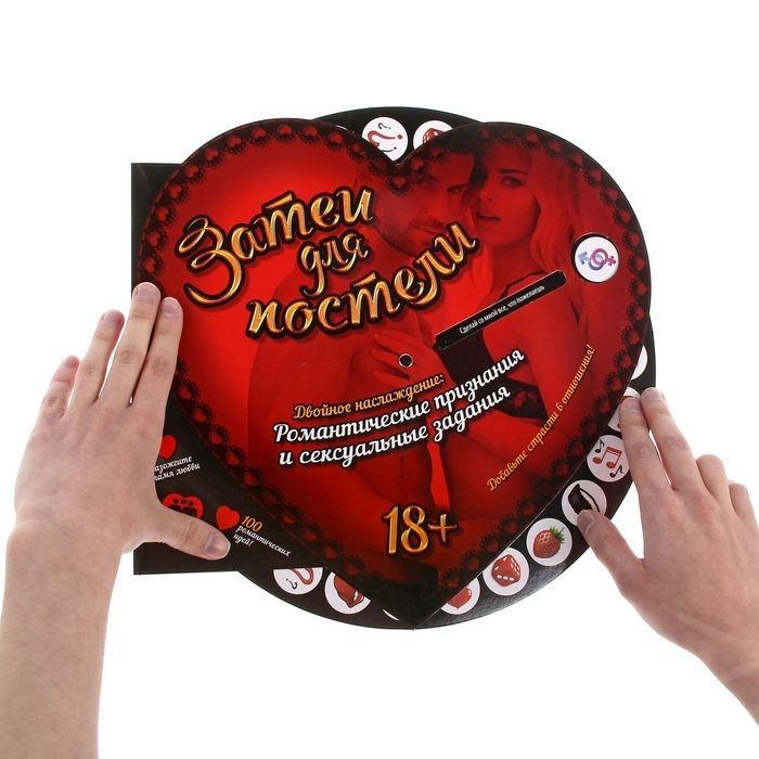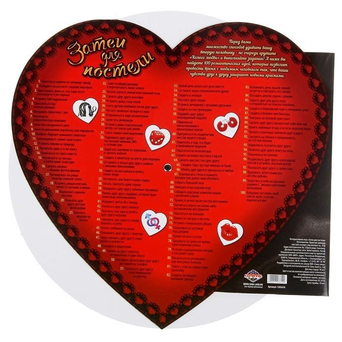 Притяжение и страсть, нежность и желание — всё сплетается воедино в этой удивительной игре. Она заставит ваши сердца биться чаще, а тела желать продолжения этого вечера, который плавно превратится в ночь, полную любви. Отдайтесь наслаждению и добавьте искру в отношения! Правила очень просты: передавайте колесо и по очереди вращайте его. В выпавшем секторе вы увидите задание, которое необходимо выполнить. Участвуйте в ролевых играх, дарите друг другу ласки и тысячи поцелуев, а также исполняйте самые откровенные желания любимого человека. На обороте вы найдёте 100 романтических идей, чтобы удивить свою вторую половинку. Проведите время вместе так, чтобы воспылать друг к другу чувствами!