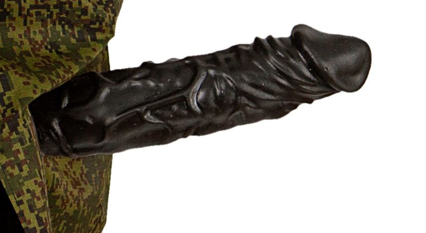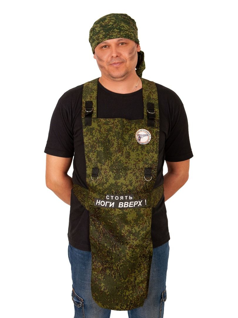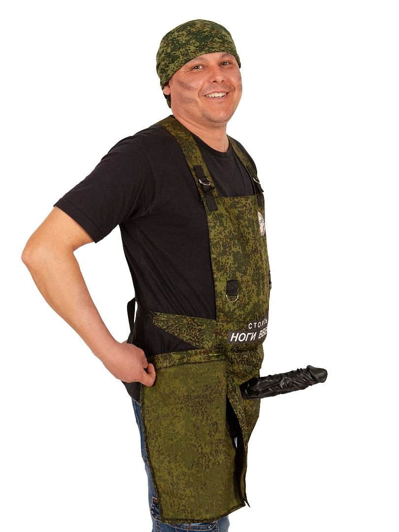 При открытии ткани правой рукой - фаллос поднимается. При закрытии двойной ткани обратно на липучку, фаллос опускается. Регулируется по росту - лямки на липучке, по объему талии - на поясе застежкой фастекс. В комплекте: фартук, фаллос, бандана. Длина передника - 70 см., ширина - 50 см. Длина фаллоса - 20 см., диаметр - 5 см.
