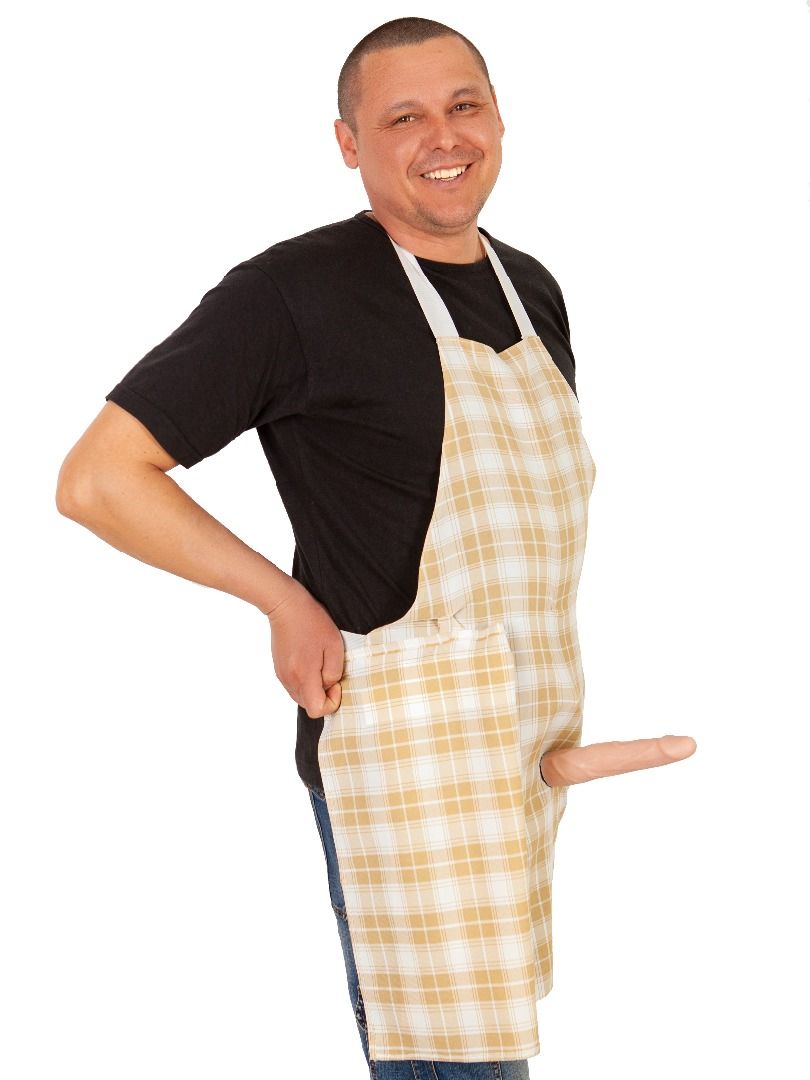 При открытии ткани правой рукой - фаллос поднимается . При закрытии двойной ткани обратно на липучку - фаллос опускается в висячее положение. В комплекте: фартук, фаллос. Длина передника - 70 см., ширина - 50 см. Длина фаллоса - 18 см., диаметр - 3 см.
