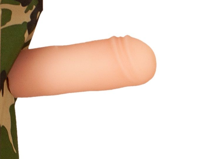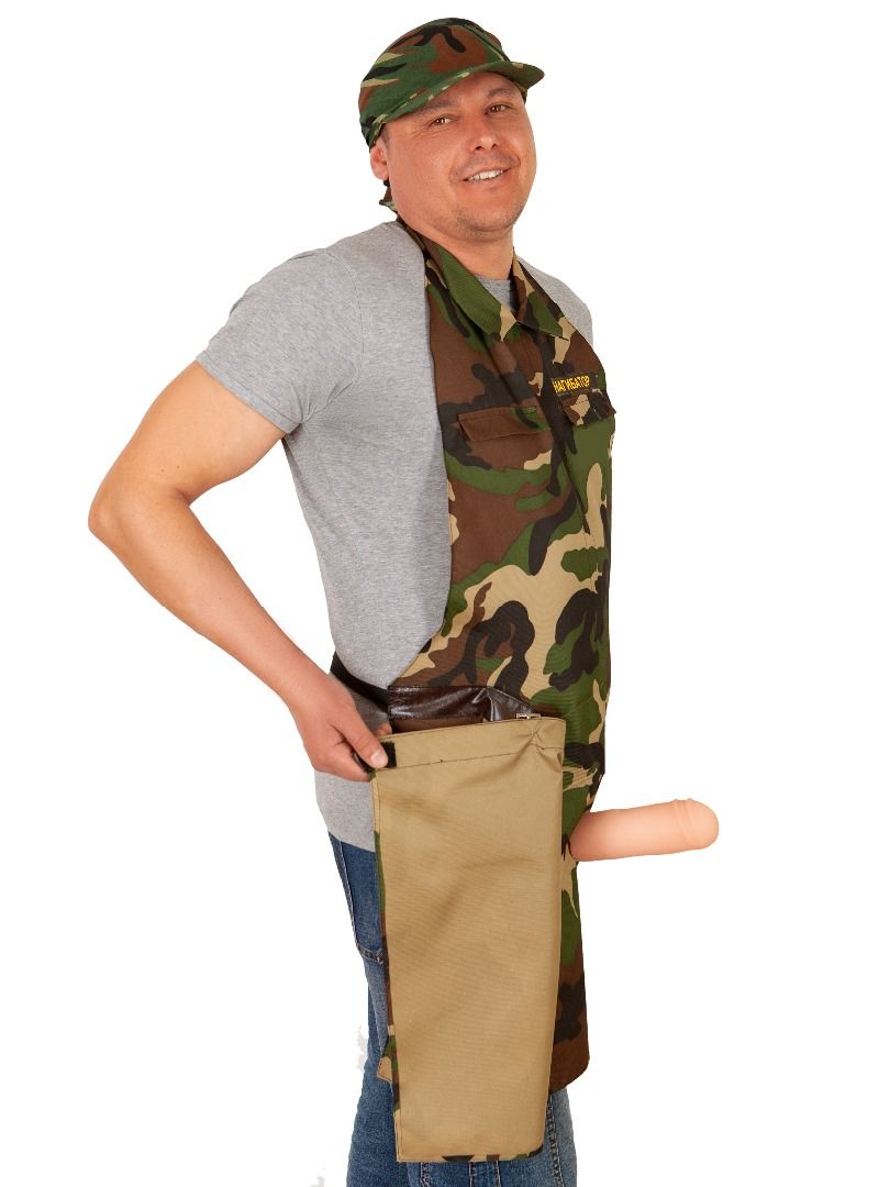 При открытии ткани правой рукой - фаллос поднимается. При закрытии двойной ткани обратно на липучку, фаллос опускается в висячее положение. Регулируется сзади: по росту - за шеей на липучке,по объему талии - на поясе застежкой. В комплекте: фартук, фаллос. Головной убор не входит в комплект! Длина передника - 70 см., ширина - 50 см. Длина фаллоса - 18 см., диаметр - 6 см.