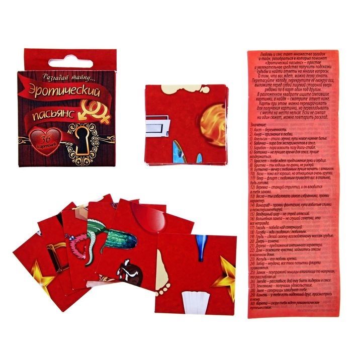 Волнуют сердечные дела? Конечно, да! Можно по пальцам пересчитать людей, которых они не волнуют. Получить ответы на любовные вопросы, обновить сексуальные отношения, разбавить повседневную скуку – все это даст вам «Эротический пасьянс». Что же там такое? Разложив пасьянс, вы найдете конкретные ответы на свои вопросы: что происходит и как сделать, чтобы улучшить ситуацию или поддержать ее на том же уровне. Например: совпавшая картинка с изображением платья говорит о том, что страсть прошла и нужно обновление, а совет в этом случае будет следующий – поиграть в ролевые игры. Получи подсказки в самых сокровенных вопросах! Внутри вы найдёте: 36 карточек инструкция с толкованием.