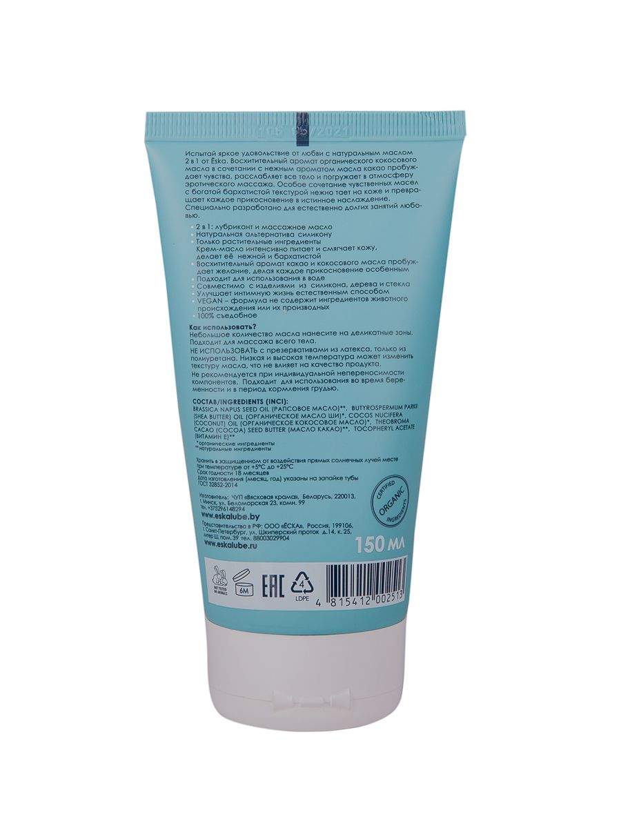 Испытай яркое удовольствие от любви с натуральным маслом 2 в 1 от Ёska. Восхитительный аромат органического кокосового масла в сочетании с нежным ароматом масла какао пробуждает чувства, расслабляет все тело и погружает в атмосферу эротического массажа. Особое сочетание чувственных масел с богатой бархатистой текстурой нежно тает на коже и превращает каждое прикосновение в истинное наслаждение. Специально разработано для естественно долгих занятий любовью. Идеально для использования с изделиями из силикона, дерева и стекла. 100% натуральных ингредиентов 2 в 1: лубрикант и массажное масло Натуральная альтернатива силикону Максимально длительное естественное скольжение Только растительные ингредиенты Без силиконов, отдушек, консервантов, глицерина, минерального масла Подходит для анального, вагинального и орального секса Безопасен для использования во время беременности и в период кормления грудью Крем-масло интенсивно питает и смягчает кожу, делает её нежной и бархатистой Восхитительный аромат какао и кокосового масла пробуждает желание, делая каждое прикосновение особенным Подходит для использования в воде Совместимо с изделиями из силикона, дерева и стекла 100% съедобное Истинное наслаждение от чувственной любви Улучшает интимную жизнь естественным способом