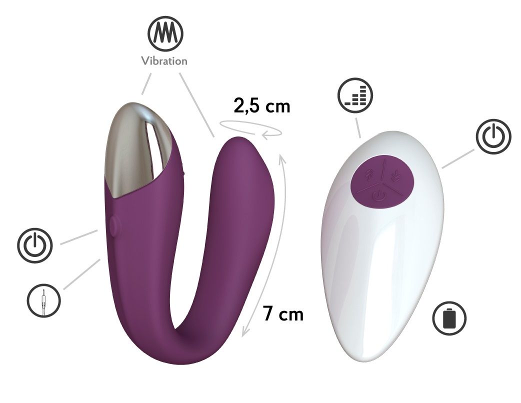 Эта нежная и бархатистая игрушка из безопасного силикона магического сливового цвета позволит усилить общее удовольствие во время секса за счёт одновременной стимуляции фаллоса партнёра, вагинальных стенок и клитора партнёрши. Регулируйте уровень вибрации пультом ДУ с 8-ю уникальными режимами и глубокое чувственное наслаждение на заставит себя ждать! Ты можешь использовать его в одиночку, а можешь взять с собой и поиграть в скрытую публичность! Время зарядки - 2 часа. Время работы - 1,5 часа.