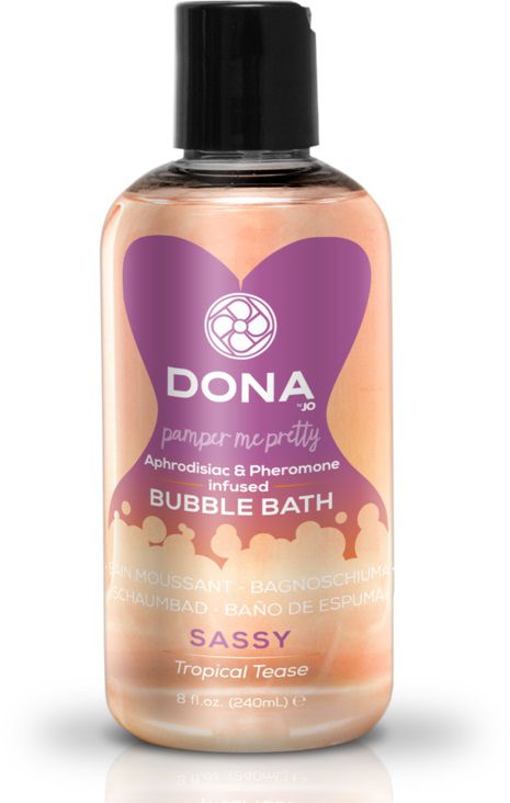 Пена для ванн DONA Bubble Bath Tropical Tease с тропическим ароматом Sassy (мангостин, мандарин, жасмин). Легкая душистая пена прекрасно расслабляет и нежит кожу, создавая чувство уюта и комфорта. Эротический оттенок придают феромоны и афродизиаки, вызывая обоюдное неудержимое желание. Наслаждайтесь друг другом в пенных завихрениях воды и пузырьков.