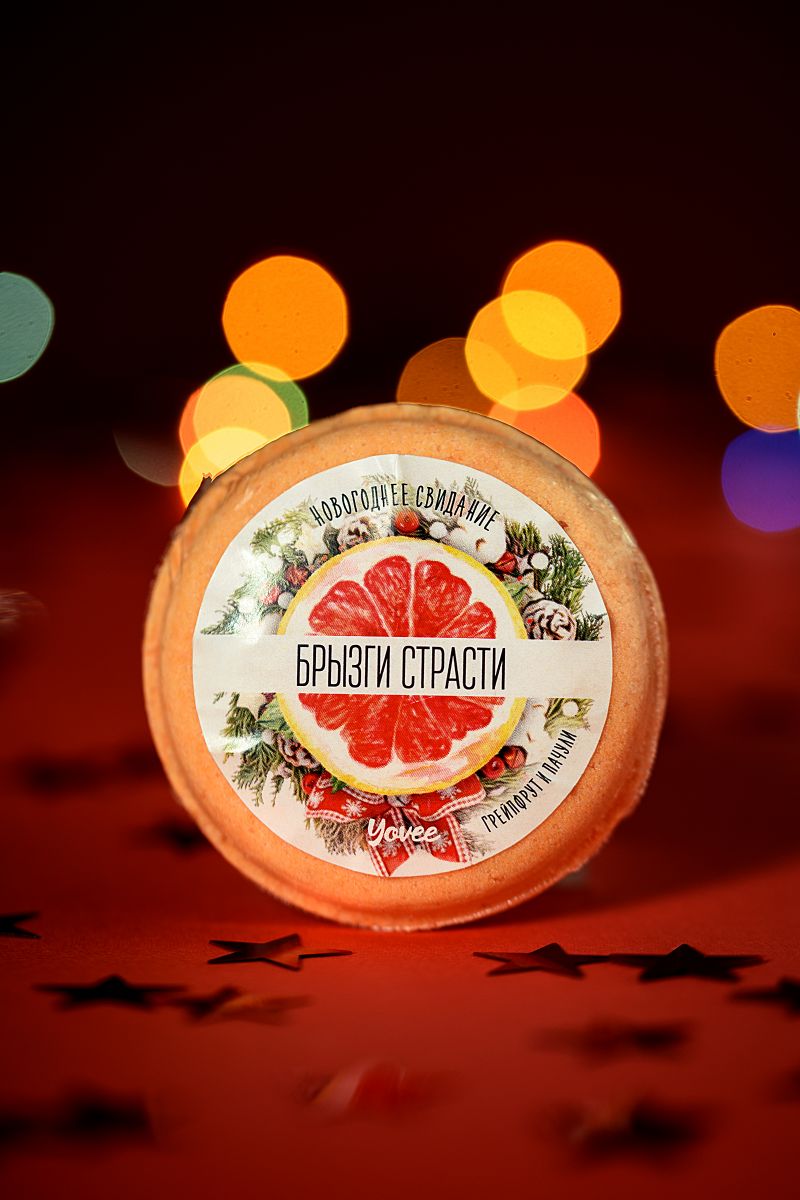 Бомбочка для ванны «Брызги страсти». Морская соль и масла в составе нежно ухаживают за вашей кожей! Идея для новогоднего свидания: предложите своей половинке принять вместе новогоднюю ванну. Афродизиак пачули в составе разбудит настоящую страсть во время принятия такой ванны.