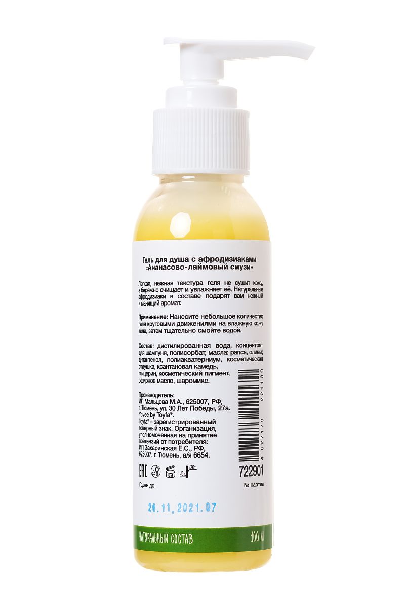 Гелья для душа с фродизиаками «Смузи в душе» Легкая, нежная текстура геля не сушит кожу, а бережно очищает и увлажняет её. Натуральные афродизиаки в составе подарят вам нежный и манящий аромат. Подготовка к свиданию: Примите душ перед волнующим свиданием. Приятный и освежающий аромат тропического ананаса и лайма подарит летнее настроение, а действие афродизиаков сделают вас по-особенному желанной для вашего партнера!