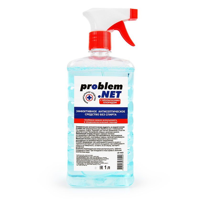 Универсальная антисептическая жидкость на водной основе Problem.net предназначена для обработки рук и поверхностей. Не содержит спирта. Подходит для частого применения. В состав средства входят бензалкония хлорид и молочная кислота. Бензалкония хлорид обладает широким спектром антимикробного действия (противогрибковым, вирулицидным, антипротозойным), инактивирует вирусы, включая коронавирусы. Молочная кислота широко применяется для очистки и дезинфекции на производственных предприятиях. Возможна индивидуальная гиперчувствительность. Избегать попадания в глаза. При попадании в глаза промыть большим количеством воды.