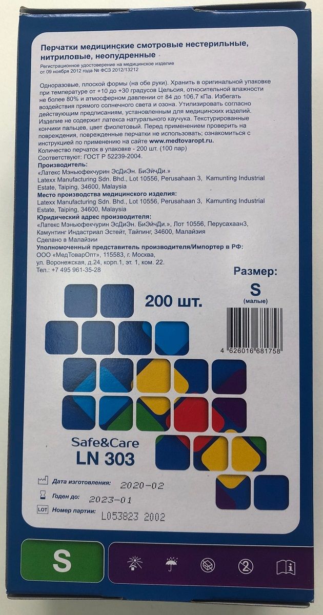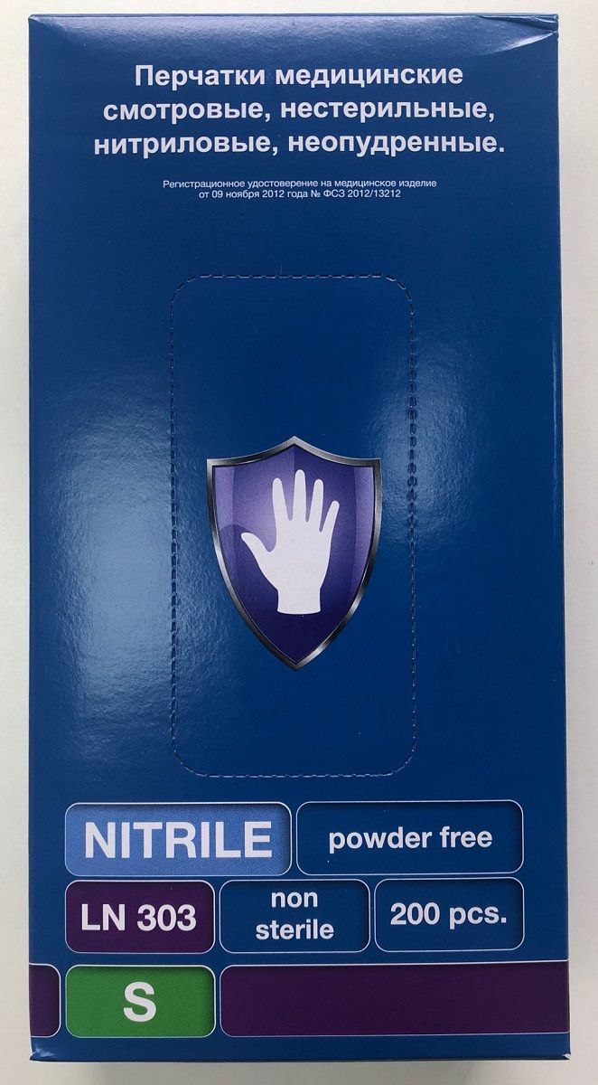Перчатки медицинские смотровые из искусственного нитрила Safe Care LN 303. Текстурированная поверхность на пальцах, универсальной плоской формы, манжета с валиком, гипоаллергенные, нестерильные. Состав перчаток не содержит протеинов латекса натурального каучука и не вызывает аллергических реакций. Длина - 245+/-5 мм. Толщина пальца (13 мм от кончика) - 0,16+/-0,02 мм. Толщина ладони (центр) - 0,15+/-0,02 мм. Толщина манжеты (25 мм от валика) - 0,10+/-0,02 мм. Герметичность AQL 1.5